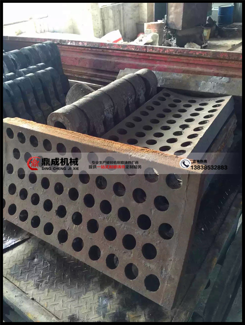 鼎成耐磨生產的破碎機篩板,結合幾十年的鑄造經驗和各類型號破碎機的具體情況,通過對錘式破碎機篩板的改造,解決了錘式破碎機因落料不暢造成堵塞悶車現象,使錘式破碎機篩板使用壽命增長,減少了設備維修、維護工作量,提高了設備臺時運轉率,增加了錘式破碎機運行的可靠性和穩定性,完善了設備系統缺陷。